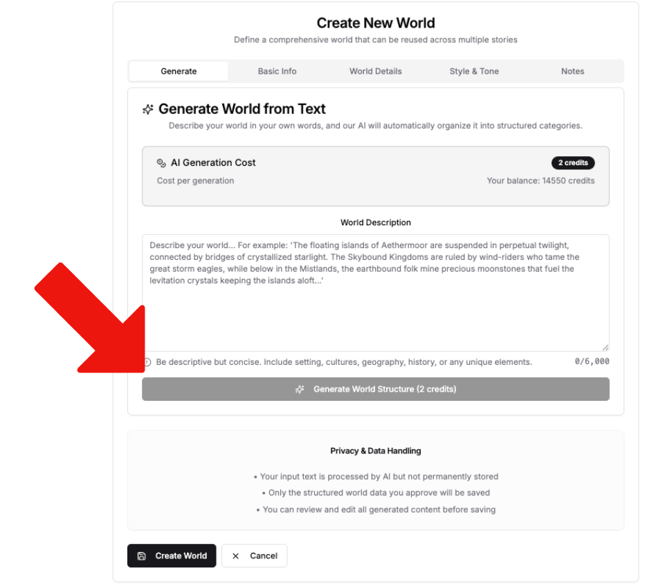 All you need to do is write a description of your world—ideally 1,000 to 1,500 words (though shorter works too). Paste that into the World Creator, and the system will generate a full world, filling out the world-building form on your behalf.