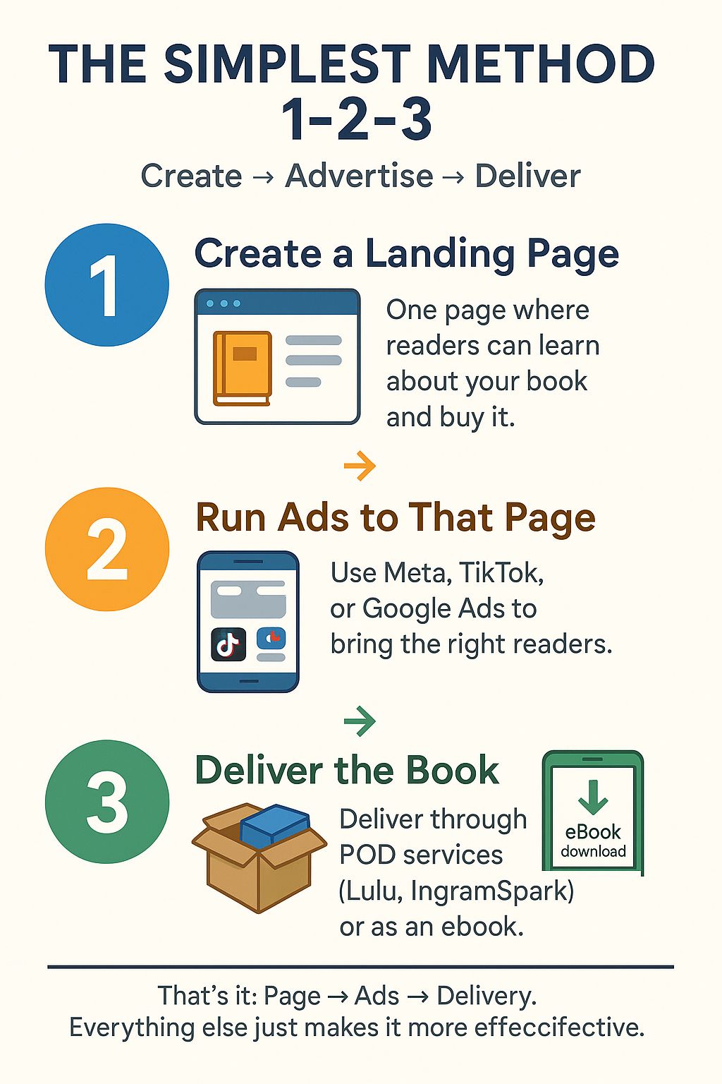 The method is clear and easy: Create a landing page → Run ads → Deliver your book. In the book, I break it all down so you can follow the same path. It’s short, direct, and designed to get you moving fast.
